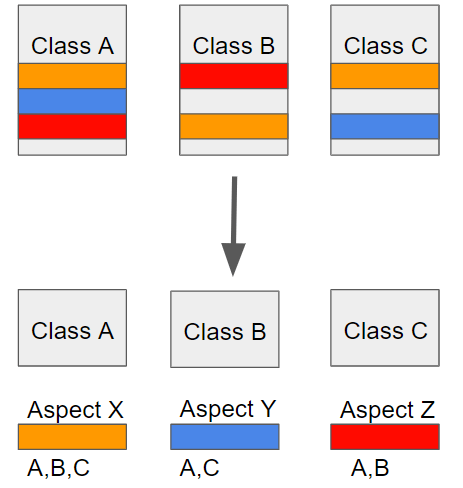 - プログラム中から横断的関心事を取り除き、一箇所に集めることを「横断的関心事の分離」と呼び、これを実現する手法