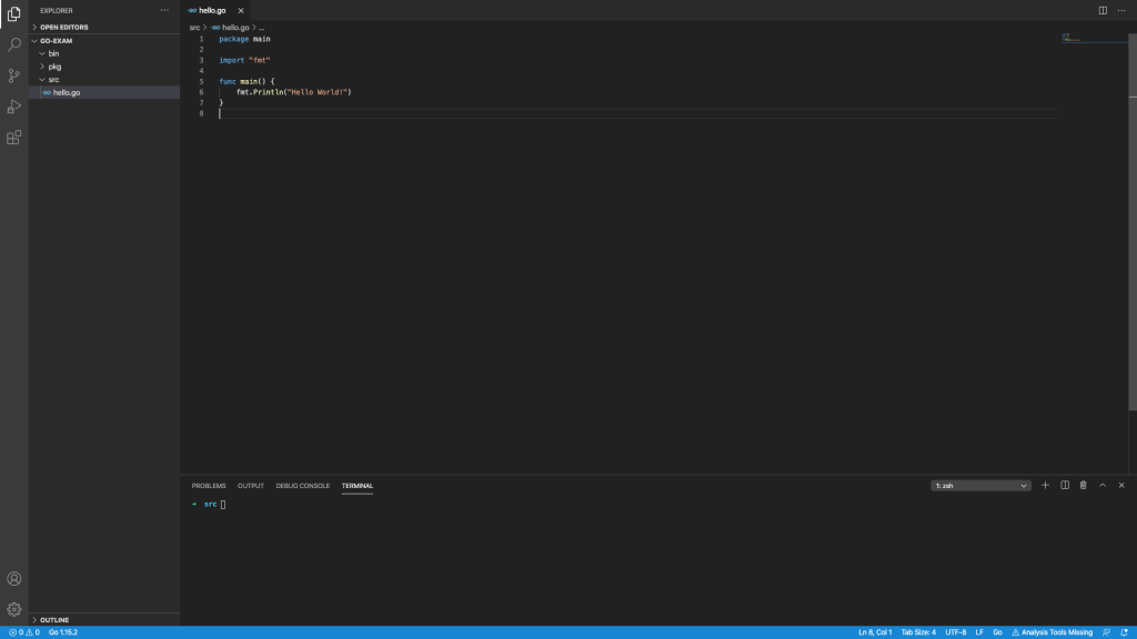 - src配下に「hello.go」ファイルを作成します。Golangは拡張子として「.go」を使います。