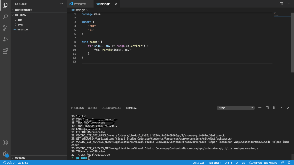 - Environ()、Getenv(”環境変数名”)、Setenv(”環境変数名”、”設定値”)などがあります。