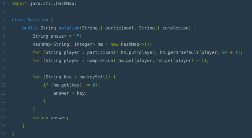 マラソン選手たちがマラソンに参加しました。たった一人の選手を除いて、すべての選手がマラソンを完走しました。 マラソンに参加した選手たちの名前が入っている配列participantと完走した選手たちの名前が入っている配列completionがパラメータとして与えられた場合に完走できなかった選手の名前をreturnするようにsolutionメソッドを作成してください。