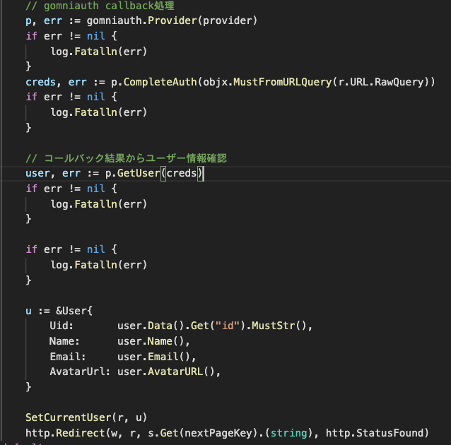 - 認証に必要な情報を抜き出したり、ユーザー情報を取得するときにエラーチェックも行っています。