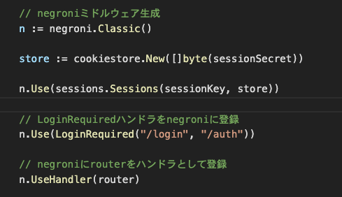 - n := negroni.Classic():negroniミドルウェア生成し、代入します。