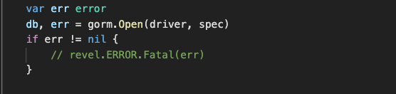 エラー内容:cannot assign *gorm.DB to db (type gorm.DB) in multiple assignment