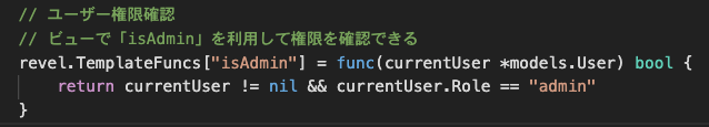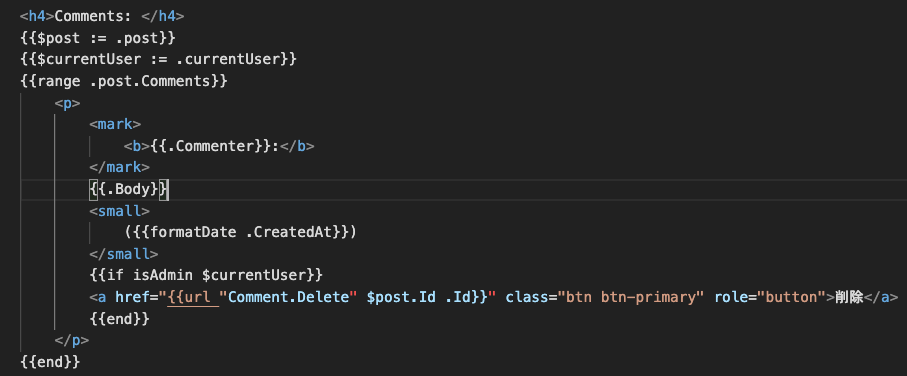 - {{if isAdmin $currentUser}}:「isAdmin」でTemplateFuncsをアクセスし、パラメータとしてcurrentUserを渡しています。結果わbool型なので、条件分岐に使っています。