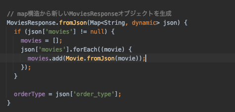 - MoviesResponse.fromJsonはモデル(Model)が持っている関数で、MapからMoviesResponse型に変換する関数です。