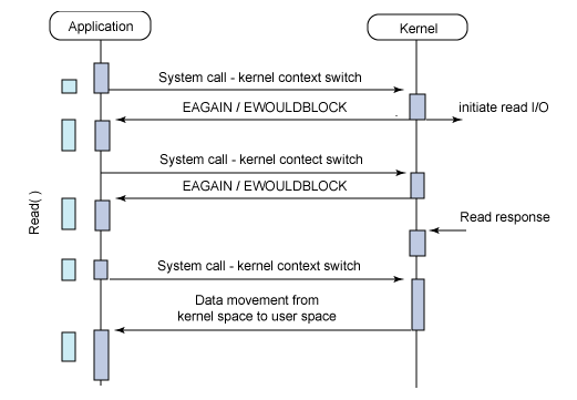ノンブロッキングI/OではI/O対象のファイルディスクリプタの準備完が了していないことをアプリケーション側に伝えるため即座にエラーが返る(errnoにEGAINが格納されて返ってくる)。
