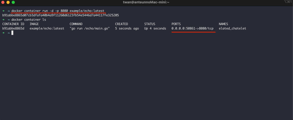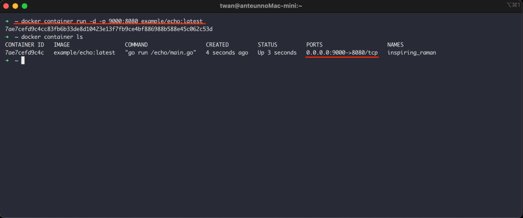 - 「9000(ホストポート):8080(コンテナポート)」のような形式で使います。