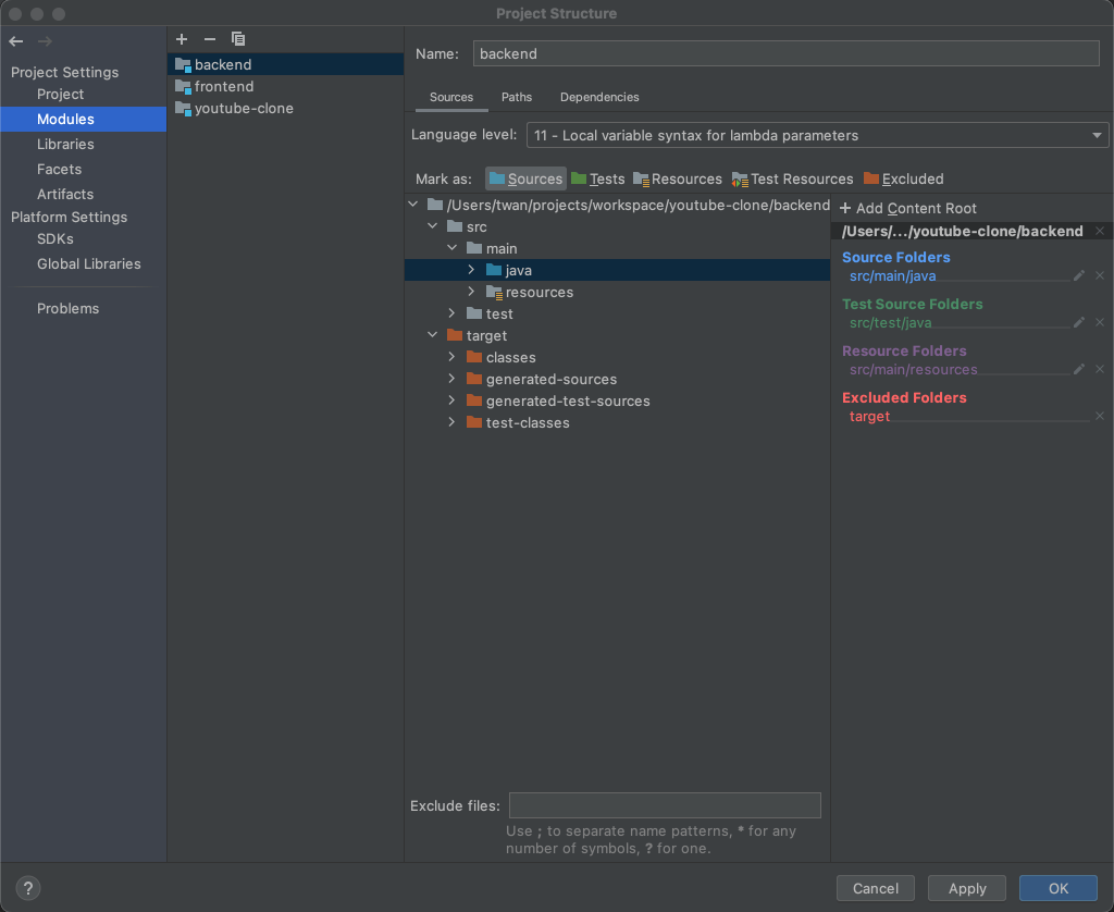 Modules→Sourcesを開いて元々のRoot Pathを削除し、移行するモジュールを選択します。