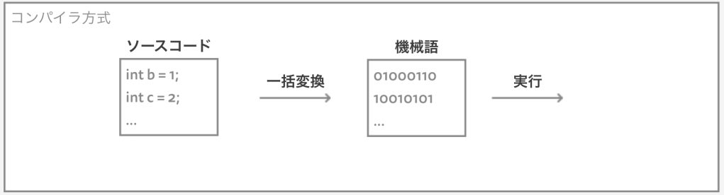 - 命令(コード)を機械語に一括で変換(コンパイル)を行ってから実行を行う。