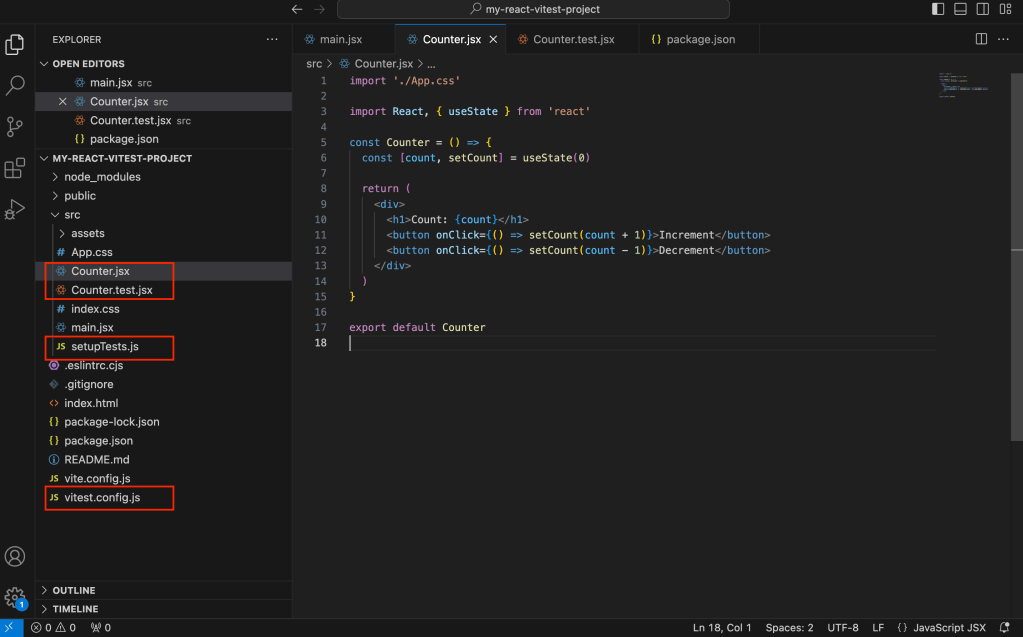 テスト対象となるサンプルコンポーネントを作成しましょう。src/Counter.jsxファイルを作成し、以下の内容を追加します。
